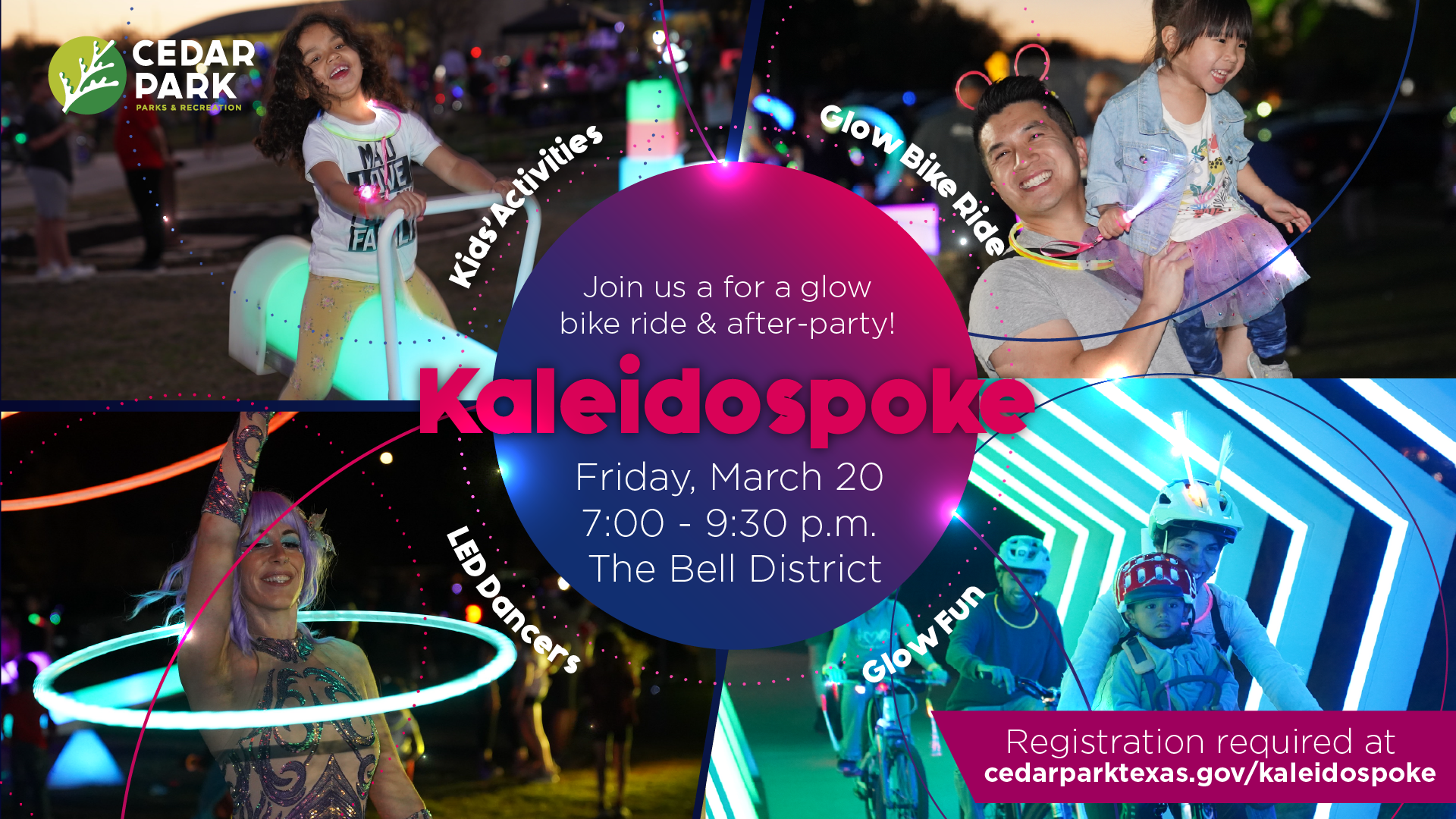 Let’s Glow Riding; Kaleidospoke is a glow bike ride and after-party for the whole family! Cycle around the one-mile paved path and then stay for the glow party at the end of the ride. The party features a DJ, glow dancers, LED swings, and LED seesaws. Glow novelties and decorations are encouraged, so bust out the flair, light up your bike, and get ready to have a good time at this illuminating event. Registration is required.